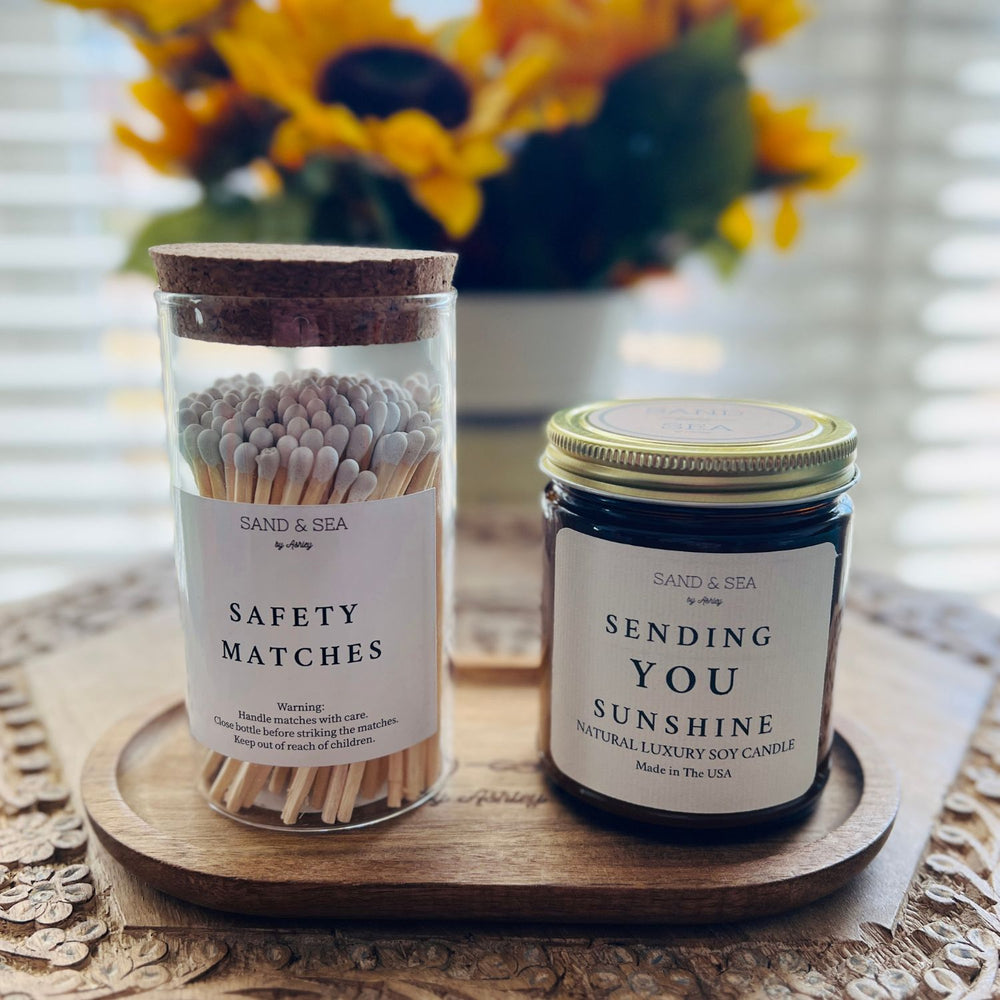 Ignite your adventurous spirit with our Sending You Sunshine Candle Gift Sets for Her! This bold set includes our signature sunshine candle, safety matches, and a wooden tray. Bring warm and uplifting vibes to your day with this gift set that's sure to light up your life!