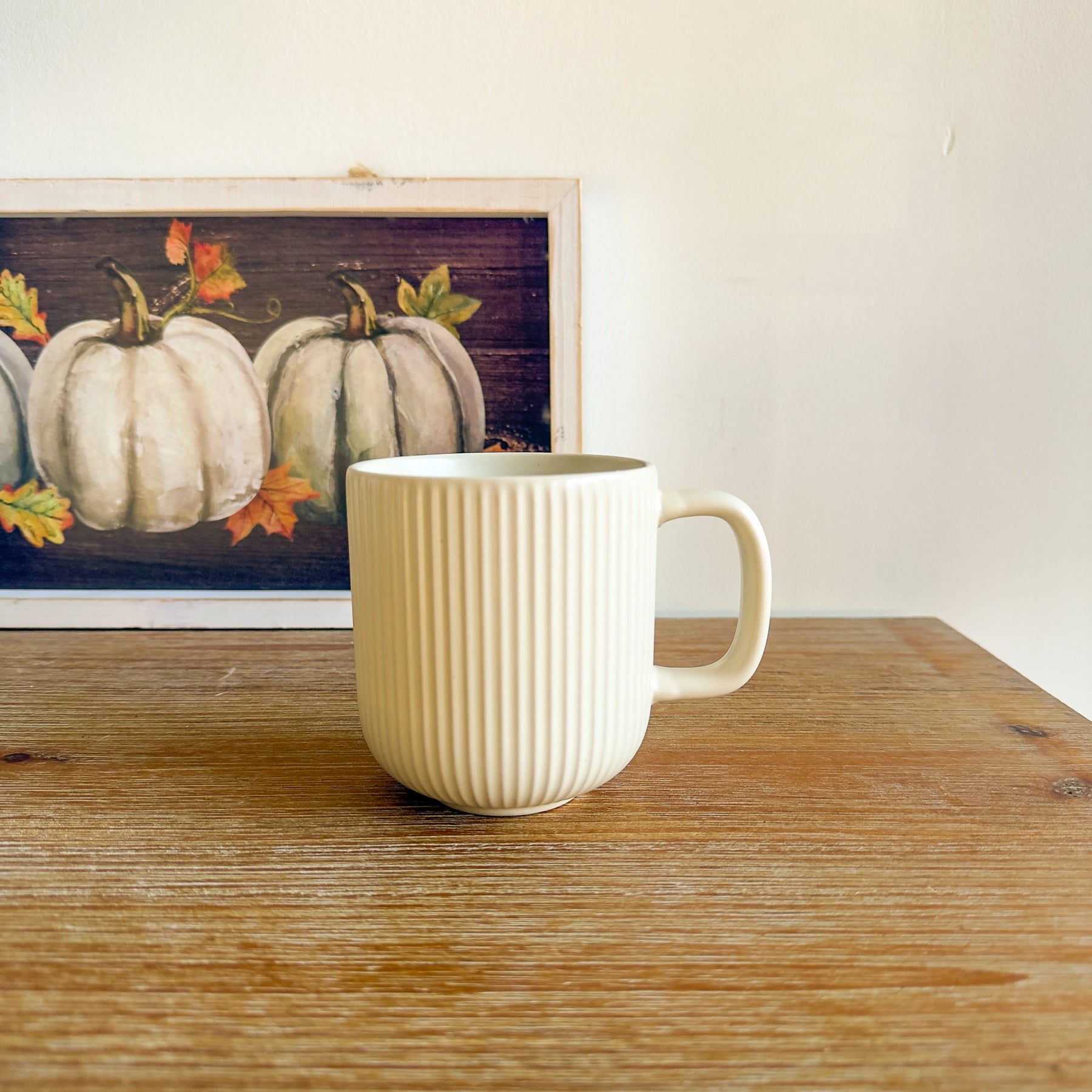 • Cream Ribbed Ceramic Mug — modern, durable, and comfortable to hold, perfect for tea or coffee moments.